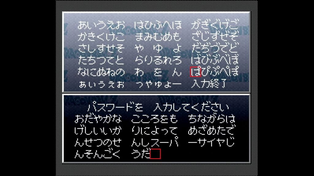 バンダイより、1995年9月22日に発売されたアドベンチャーゲームの『ドラゴンボールZ 超悟空伝覚醒編』。本作の裏技がいきなりエンディングです。こちらの裏技を利用するときは、まず「ニュー・ゲーム」を選んだ後に「突撃編のつづき」を選択。パスワードでこちらを入力すればOK! スタッフロールが流れるだけの、ちょっと地味なエンディングが見られます。