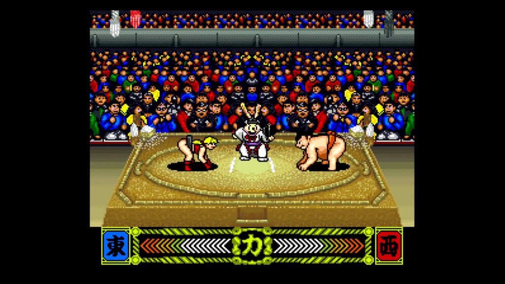 画面上で踊っていた力士のが数が4人から8人に増えれば成功。この後「しょうしん」モードでゲームをスタートすると、女性力士が選べるようになります。
