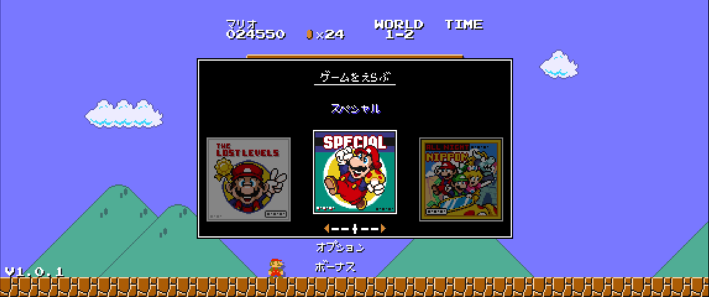 ゲームは『スーパーマリオブラザーズ』だけではなく、『スーパーマリオブラザーズ2』や『オールナイトニッポンスーパーマリオブラザーズ』なども選択可能。この『スーパーマリオブラザーズ』も、ゲームオーバーになってもクリアしたステージの続きから遊べる「ストーリーモード」や「チャレンジ」、「マラソン」などユニークなモードも追加されています。