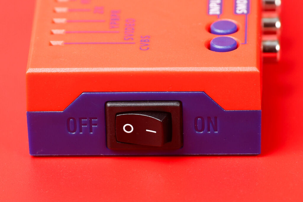 本体上部には、入力の切り替え用と映像出力モードを切り替えるためのボタンが配置されています。側面側には、コンポーネントとS端子、コンポジットの入力端子が並んでいるほか、HDMI出力と電源用のUSB端子、そしてかなりゴツメの電源ボタンも用意されています。