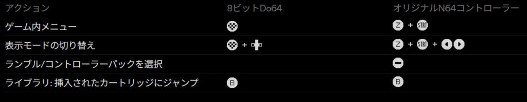 Analogue 3Dでは、ワイヤレスコントローラー使用時に仮想コントローラーまたはランブルパックを使用できます。これらのパックは、ゲームに応じて必要に応じて自動的に有効になります。両方をサポートするゲームでは、仮想コントローラーパックがデフォルトで有効になっています。ゲーム中に仮想コントローラーパックとランブルパックを切り替えるには、8BitDo 64コントローラーのSelectを押します。