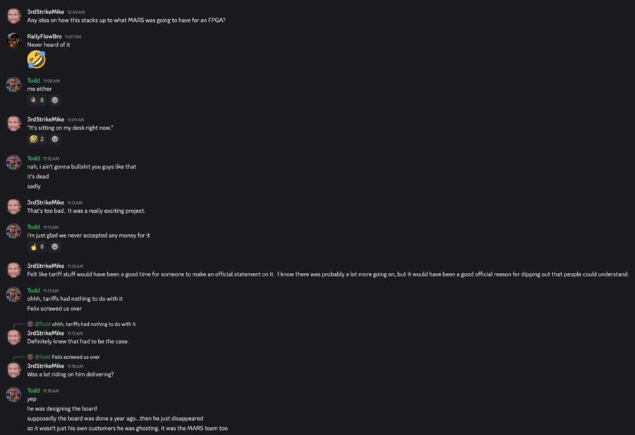 こちらは筐体の設計を行っていたTodd Gill氏Discordで発表したものとのこと。Redditの『MARS FPGA』関連のサブレディットもウォッチしていましたが、ほぼ1年以上前から動きが無い状態になっていました。