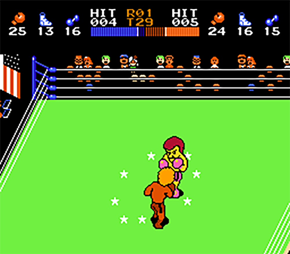 操作は、移動(ステップ)、パンチ、防御の3つと非常にシンプルですが、これらを組み合わせることで、ストレート、ボディブロー、フック、アッパーカットなどを打ち分けられるほか、さらに条件が揃うことで特別な必殺技なども発動します。ちなみに試合中にはクリンチやインターバルでのボタン連打で体力の回復なども行えるので、これらも上手に使うことが攻略の秘訣となるでしょう。