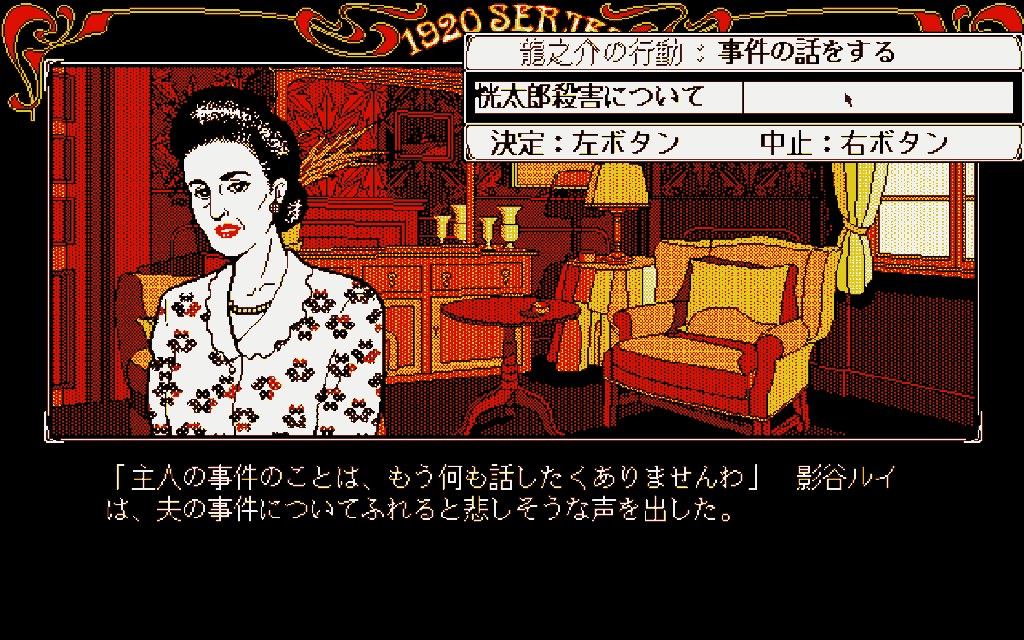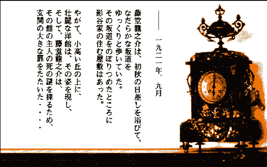 本作は1988年にリリースされたコマンド選択方式のアドベンチャーゲームで「藤堂龍之介探偵日記シリーズ」の第一弾にあたる作品。プレイヤーは探偵の藤堂龍之介となって、「琥珀館」を舞台とした殺人事件に挑むことになります。