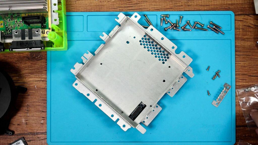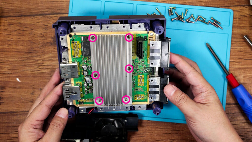 これでドライブ部分が取り外せるようになります。こちらは後でドライブレス化するための作業のときに必要になるので、ひとまずよけておきましょう。ドライブ部分を取り除くと巨大なヒートシンクが現れます。こちらに付いているネジを外していきます。