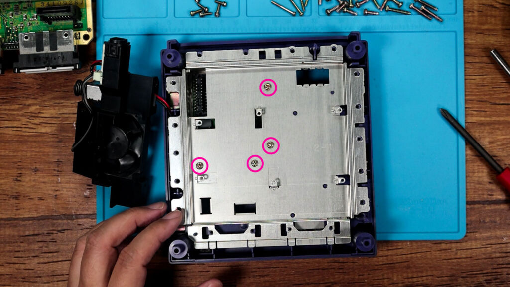 ボードを取り除くと、ふたたび銀色のパーツが出現します。こちらも4ヵ所のネジを外して取り外しましょう。