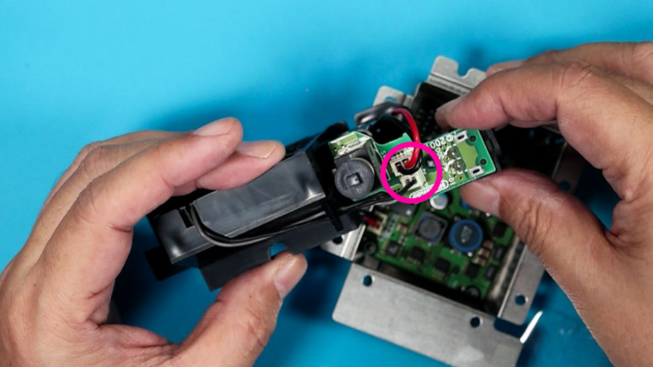 パーツを取り除いたら、新しいシェルに乗せ換えていくのですが、その前に電源をUSB化するための交換を行っていきます。まずは、最後に取り除いた小さな基板と電源部分のケーブルを外しましょう。