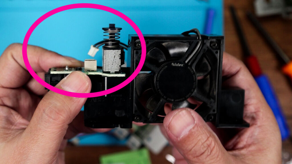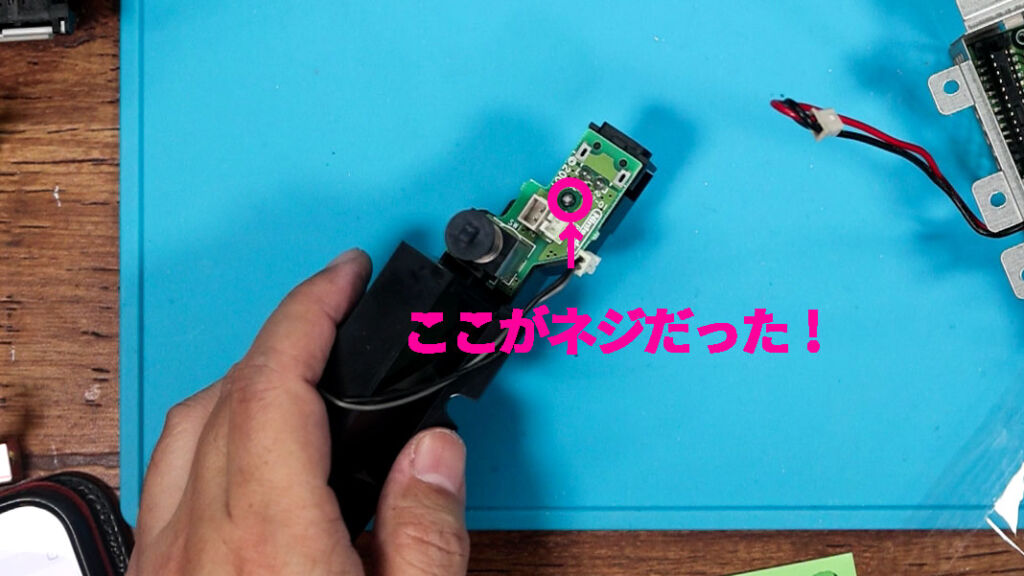 これで交換部分を取り除いて差し換える……と思いきや、なんか、はずせない!? ここが最初に躓いてしまったポイントでした。てっきり無理矢理引っぺがすのかと思ったのですが、なんかよく見るとネジっぽい箇所があることを発見。レーザーの調整をするときのボリュームみたいなものだと思っていたのですが、実はまさしくネジだったというわけです。