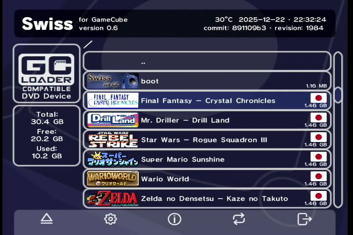 ここから最新のファイル(swiss_rxxxx.7z)を入手して解凍。たくさんのファイルやフォルダが解凍されますが、そ中から「GCLoder」フォルダ内にある「boot.iso」をSDカードのルートにコピーします。また、ゲームキューブのROM(.iso)を同じくSDカードのルートにコピーして起動すると『GCLoder』のメニュー画面が立ち上がります。