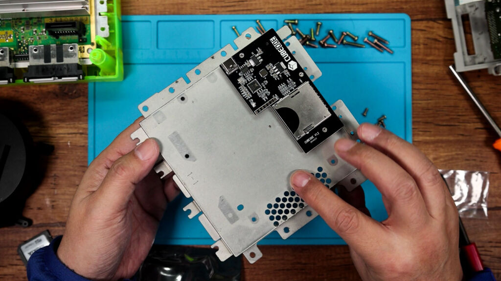 ちなみに、流用するのはこの銀色のパーツとネジだけで、元のドライブ部分はもう使わないため片づけておきます。次に、銀色のパーツに『CUBEODE』を取り付けていきます。ネジ穴などを確認しながら位置を合わせて、付属のネジを3ヵ所に取り付けていきましょう。