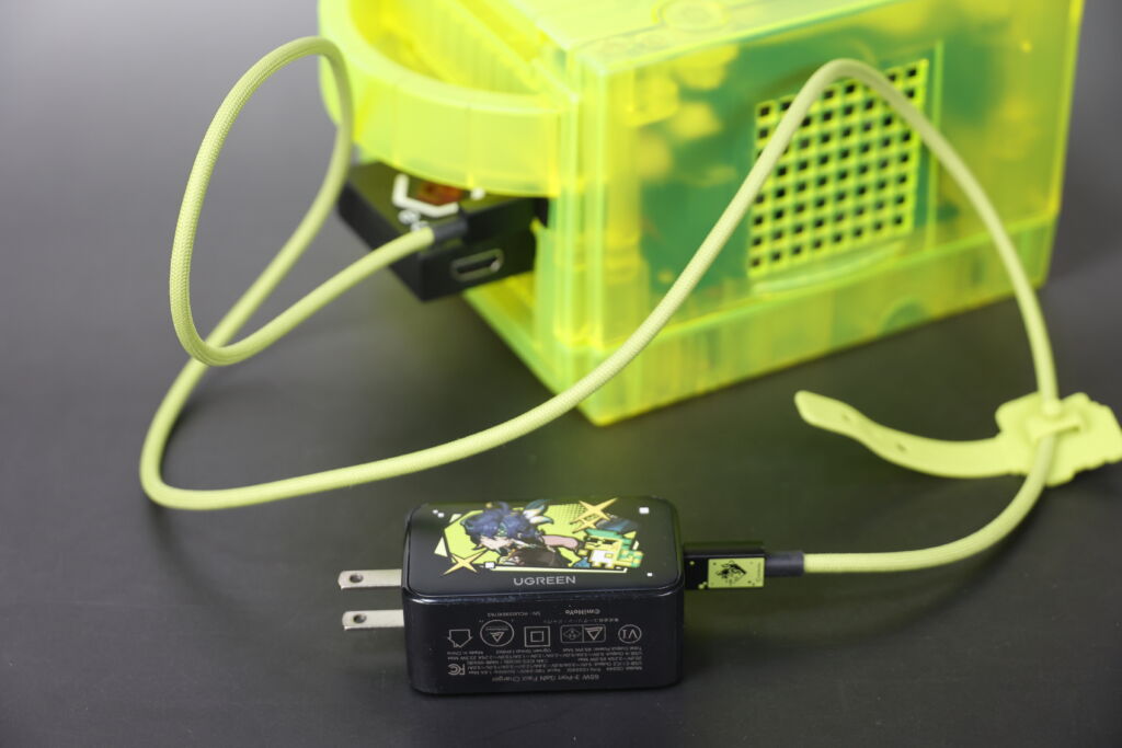そこで自宅を探したところ、唯一その条件をクリアしていたのが『UGREEN Nexode 急速充電器 65W 原神モデル』でした。ついでに『UGREEN USB-C to USB-C ケーブル 100W 原神モデル』も所有していたので、そちらも活用してみることに。すると、見事に電源が入り起動させることができました。