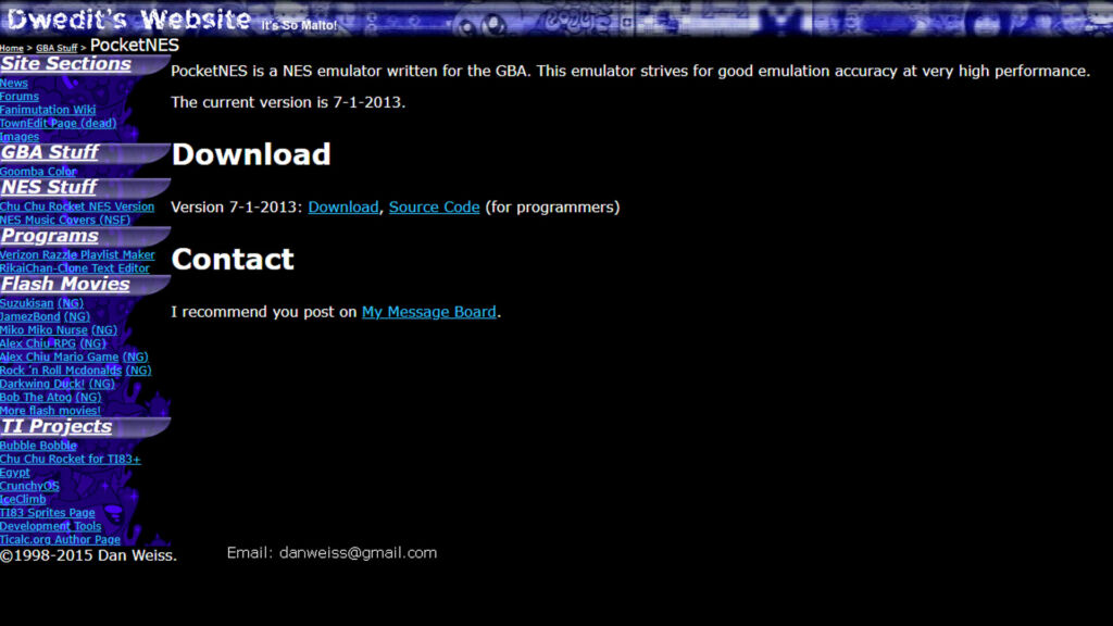 ということで、先ほどご紹介したエミュレーターですが、本機ではファミコンとゲームボーイカラーに対応したものが遊べます。具体的には「Dwedit’s Website」サイトにアクセスし、ゲームボーイカラーエミュレーターの『Goomba Color』とファミコンエミュレーターの『PocketNES』を入手します。