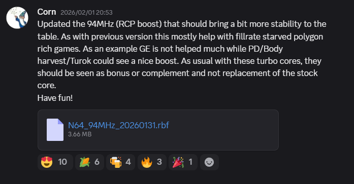 94MHz(RCPブースト)をアップデートしました。これにより、安定性が若干向上するはずです。以前のバージョンと同様に、主にフィルレートが不足するポリゴン数の多いゲームで効果を発揮します。例えば、GEはあまり効果がありませんが、PD/Body harvest/Turokでは大幅なブーストが見込めます。これらのターボコアは、通常通り、標準コアの置き換えではなく、ボーナスまたは補完的な役割を担うものとして捉えてください。それでは、お楽しみください!