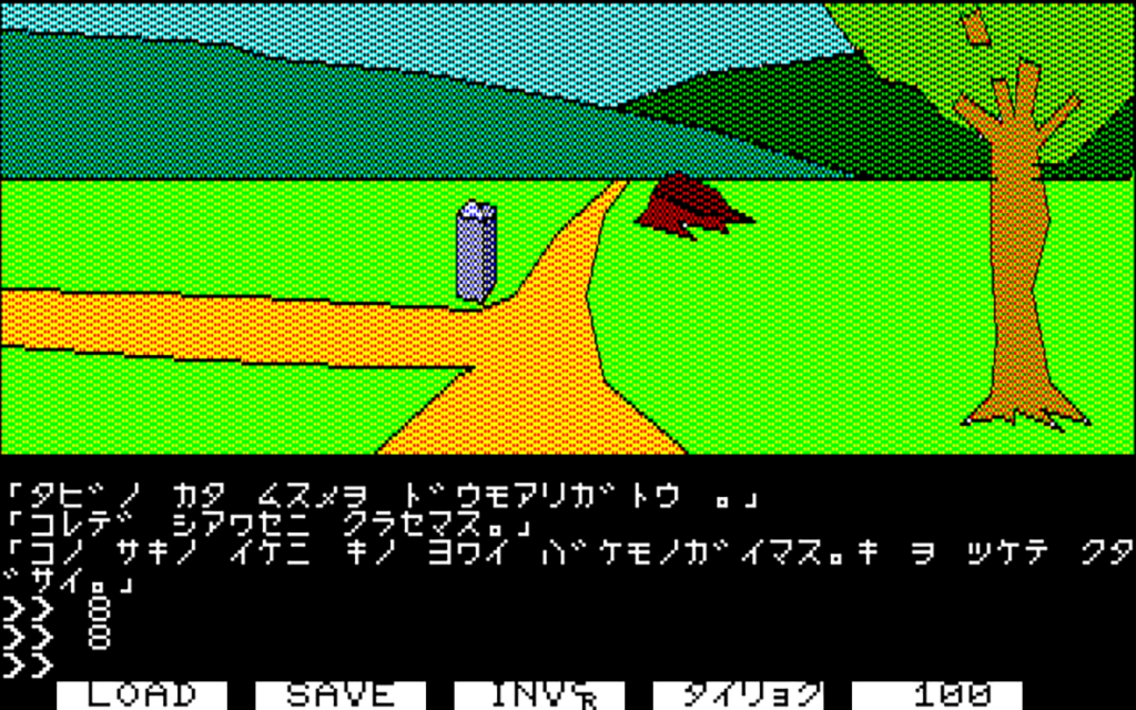 ゲームは当時主流だったカナによるコマンド入力方式を採用しており、“カワ ワタル”などの名詞+動詞を場面にあわせて使うことでゲームは進行します。不思議な琵琶法師、謎の少女、そして人を食らうモンスターなど、独特の世界観が魅力の本作。選択肢を間違えただけで瞬時にゲームオーバーになる理不尽さも含めて、まさに王道のレトロアドベンチャーゲームといえるでしょう。