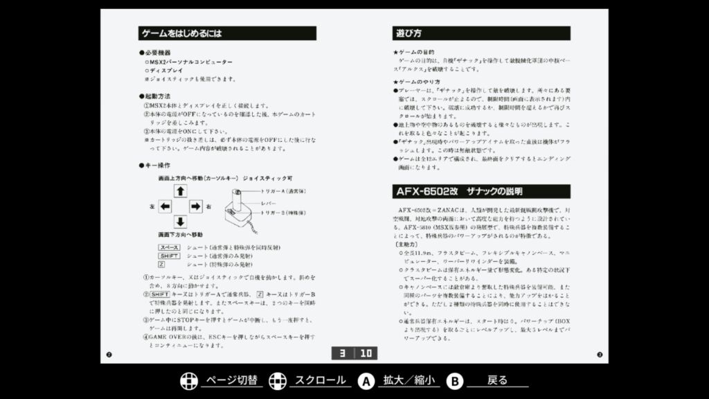ストーリー的にはMSX版『ZANAC』の後日譚という位置づけとなっており、プレイヤーは最新鋭AFX-6502 “ザナック”を操作して有機知性体と戦います。AFX-6502 “ザナック”は、ショットと特殊武器を装備しており、戦闘中に登場する数字チップを取ることで特殊弾を切り替えたり、同じチップを連続して取れば特殊弾を強化したりできます。